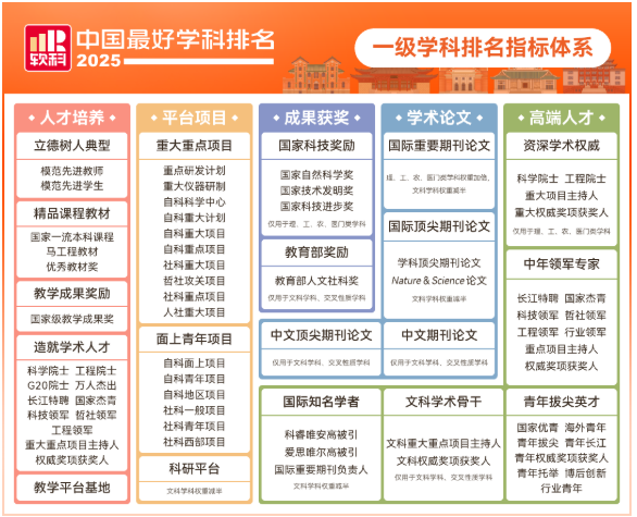 软科中国排名采用国务院学位委员会、教育部颁布的《研究生教育学科专业目录(2022年)》的学科口径。软科中国最好学科排名(一级学科)指标体系包括人才培养、平台项目、成果获奖、学术论文、高端人才5个指标类别,下设19个指标,共计200多项反映学科竞争力的观测变量。软科中国最好学科排名的数据全部来自第三方数据源,如教育部、科技部、国家自然科学基金委员会、国际和国内文献数据库等。