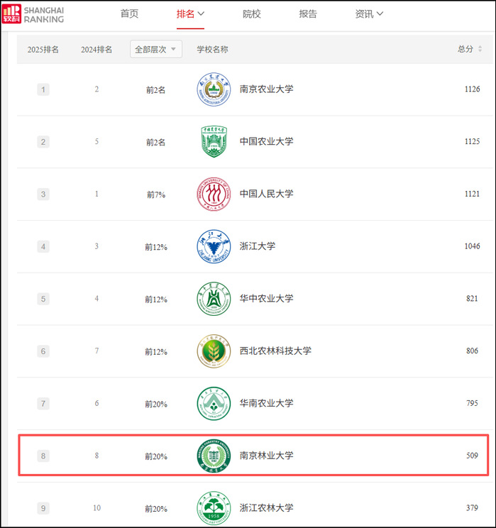 近日,2025软科中国最好学科排名正式发布,我院农林经济管理学科连续两年位列全国排名第八位。近年来,学院秉承“崇尚学术、丹心育人”办学理念,坚持走内涵式发展道路,师资队伍、科学研究、社会服务与人才培养等事业方面均得到了快速发展,学科建设水平显著提升。农林经济管理现为国家林草原局重点学科、江苏省重点学科和江苏省优势学科,在其他国内外第三方评价中,还获泰晤士中国学科评级A-、ABC中国大学学科排名第七位等好成绩。