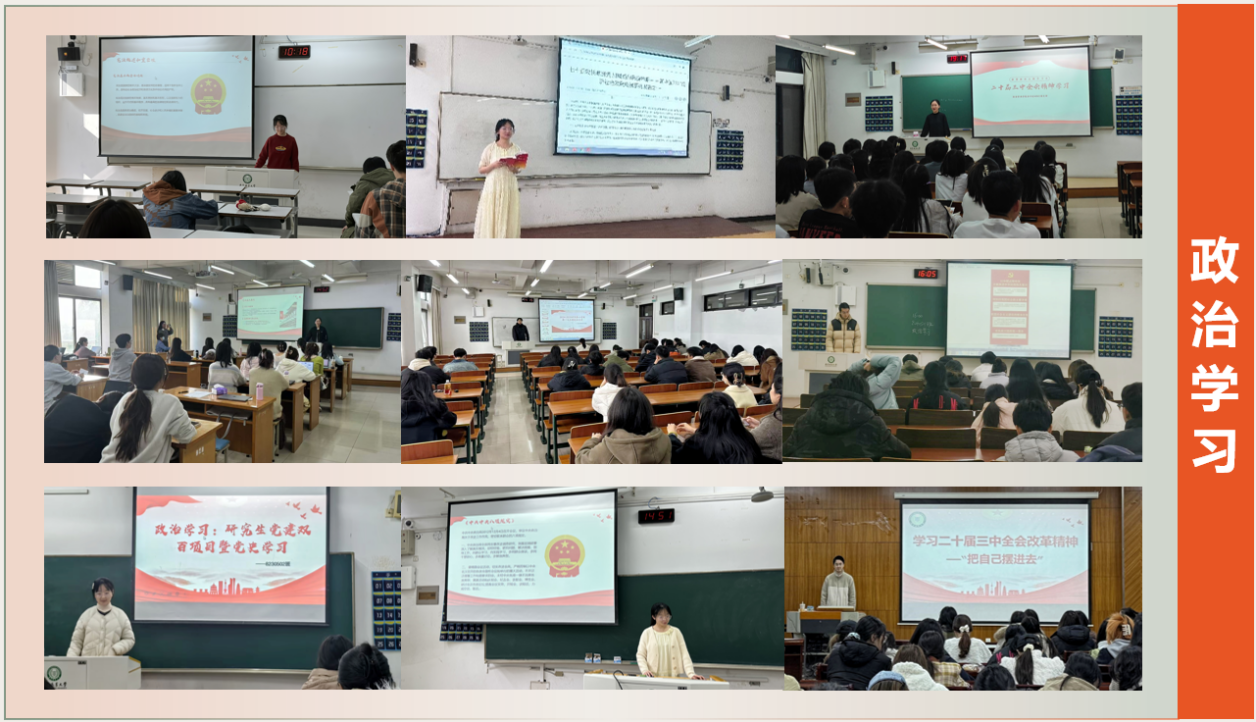 学院研究生会联合研究生各党(团)支部深入学习贯彻党的二十届三中全会精神和全国两会精神,开展党日活动20余次、政治学习60余次,筑牢思想根基,强化理论自觉。2024年12月,22级科硕党支部通过理论学习、宪法宣讲及红色观影等多元形式开展“铭记历史映初心,缅怀先烈观红影”主题党日活动,增强了支部凝聚力,激励支部党员传承红色基因、践行初心使命。2025年3月,24级科硕党支部以“践悟两会精神,奋勇担当使命”为主题,通过系统学习《政府工作报告》中关于新质生产力与经济高质量发展的重要论述,不断深化研究生党员对国家发展战略全局的理解,切实发挥研究生党支部的先锋引领作用。