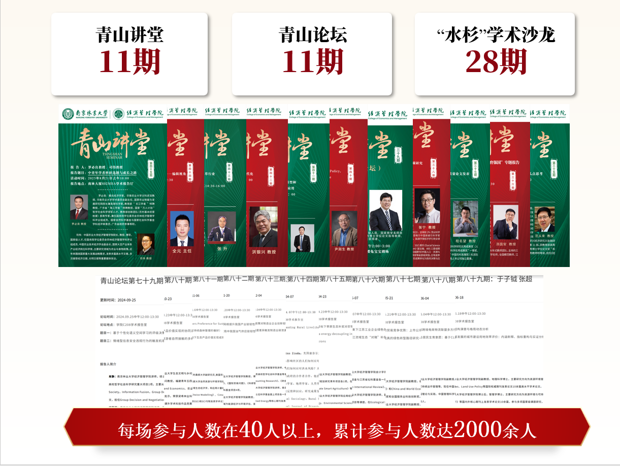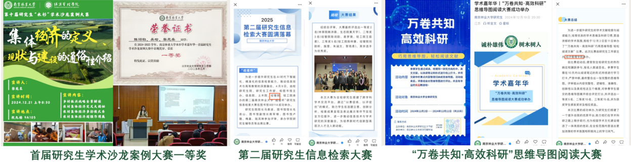 一是拓宽学术视野,学院全年举办“青山讲堂”“青山论坛”22期,邀请校内外专家学者分享学科前沿动态与实践经验。学院研究生会同步推动“水杉学术沙龙”深入班级,全年共计举办28期学术沙龙活动,累计吸引2000余人次参与,形成了上下联动的良好学术生态。二是锤炼创新能力,学院研究生会通过举办“巧用思维导图轻松阅读文献”比赛,承办第二届研究生信息检索大赛,吸引260余人次参与,有效提升了学院研究生的信息素养与科研效率,同时积极组织团队参与首届学术沙龙案例大赛,并荣获一等奖。三是筑牢学术底线,学院研究生会持续开展“寻学术之风、谈论文之道”“扬诚信之帆,启科研新程”“经管研途|学长学姐有话说”等学术诚信主题教育活动,引导学院研究生将科研诚信和学术规范意识融入科研全过程,营造风清气正的科研环境。