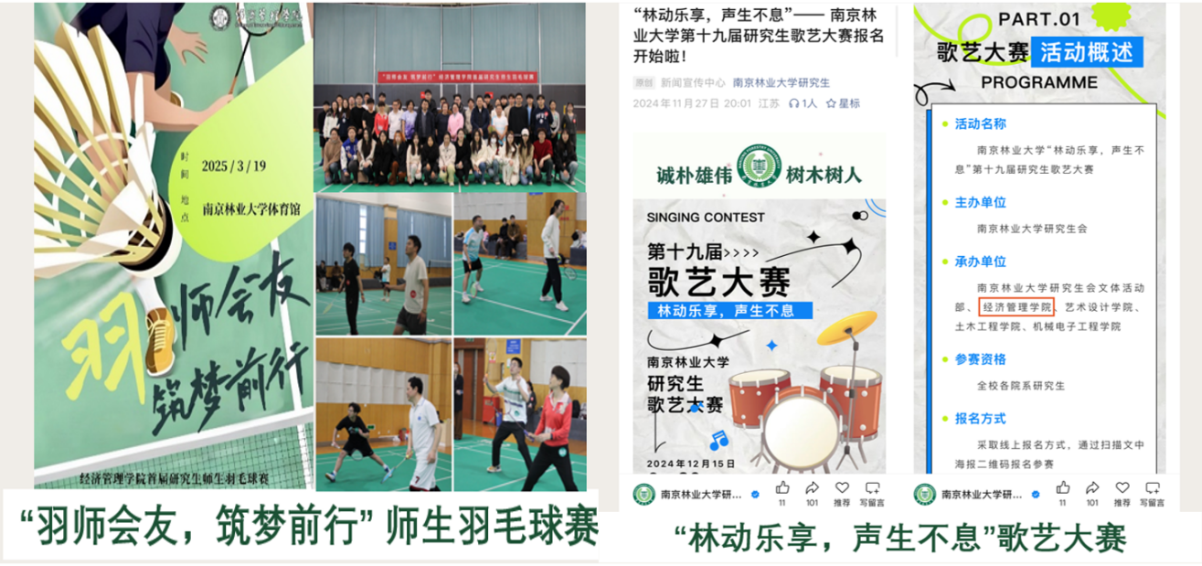 (左图为师生羽毛球赛海报和活动现场,右图为歌艺大赛宣传推文)