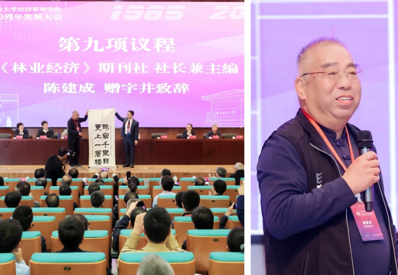 陈建成代表《林业经济》期刊社赠字并致辞。他首先向南林经管院成立40周年致以诚挚的祝贺。他表示,南林经管院在农林经济管理学科等领域研究成果显著,希望《林业经济》期刊能与南林经管院在未来继续优势互补,同舟共济,正如其赠字所言“欲穷千里目,更上一层楼”。