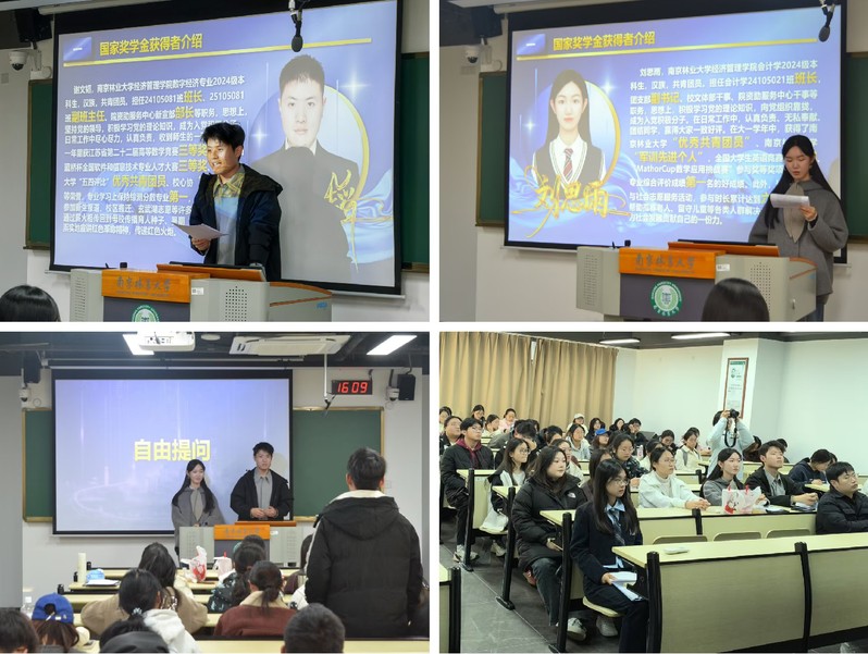 分享环节通过线下线上结合的方式,四位国奖得主从不同角度分享了自己的获奖经验。2024级数字经济专业的谢文韬首先发言,他围绕综测评分、选课策略、竞赛组队等实际问题,给出了一系列“干货”。来自2024级会计专业的刘思雨,则把重点放在了“如何学得更轻松”上。她从学习方法谈到时间管理,分享了自己如何平衡学业与生活,让在座同学看到了成长的另一种可能。“竞赛不只是为了获奖,更是不断突破自己的过程。”2022级大数据管理与应用专业的韩佳轩展示了自己大学四年积累的竞赛成果,详细介绍了备赛技巧和信息渠道,并推荐了几款实用的竞赛APP。2023级农林经济管理的袁杨荷池,用“深度、广度与韧性”概括了她的大学生活。她鼓励大家不必盲从他人,而要建立自己的学习节奏;生活中则要重视运动与健康,心态上既要有“坚持的笨功夫”,也要懂“交流的巧劲儿”。