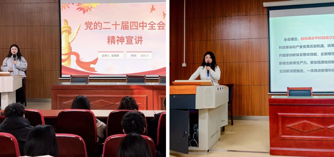 11月24至25日,学院团委书记兼学工办主任赵淑颖老师分别面向2025级研究生、水杉班及入团积极分子培训班全体同学宣讲党的二十届四中全会精神,系统梳理并深入阐释了全会的核心内容、重要成果、丰富内涵和重大意义,结合《中共中央关于制定国民经济和社会发展第十五个五年规划的建议》,围绕其三大板块、“十五五”时期主要目标、六项原则及相关决策部署进行了详细解读,引导同学们深刻领会全会精神的实质与要求。宣讲中,赵淑颖重点阐述了发展新质生产力、繁荣社会主义文化、建设美丽中国等一系列重大战略部署的时代意义,鼓励广大团员和青年自觉将个人学习研究方向同国家战略需求紧密结合,依托我校林业学科的特色与优势,主动担当作为,为学校高质量发展与国家现代化建设贡献青春智慧和科研力量。同时,她强调全体同学要以全会精神为指引,进一步坚定理想信念,明确学习目标,积极投身实践锻炼,从参与志愿服务、社会实践等日常点滴做起,以实际行动践行青年使命,展现新时代青年的责任与担当。