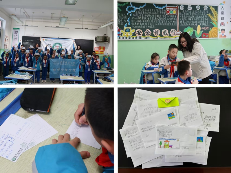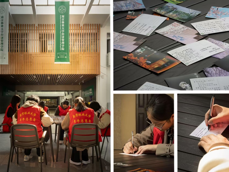 另一旁的互寄区同样温情满满。南林定制与各色彩笔整齐摆放在桌子上,路过的师生们纷纷驻足俯身,提笔写下美好祝愿;经济管理学院院楼内,同学们围坐桌边,在精美卡片上一笔一画镌刻心声:“不同的民族,同样的征途,愿我们心手相连,共赴美好明天”……数百张明信片,连结起两地的青春笔迹,也见证了一份悄然生长的真挚情谊。