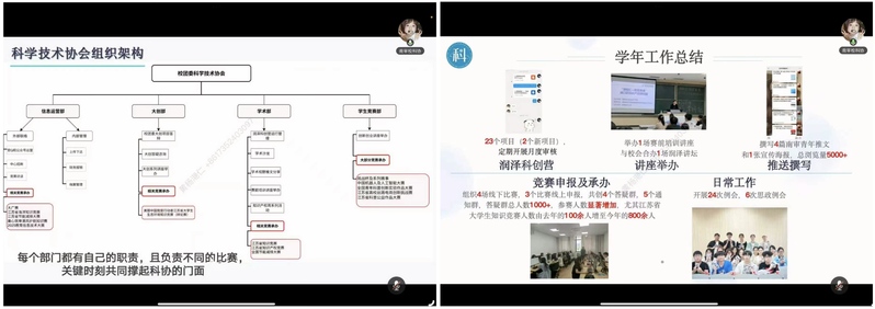 随后,南审校科协各部门负责人依次分享工作经验。在长期实践中,南审校科协始终坚持以学生成长与科创需求为导向,动态优化活动布局,打造了一系列精准赋能的优质平台。早期策划的“润泽科创营”,以创意孵化和项目培育为核心,通过学术沙龙、专业指导与资源对接等多元形式,助力学生实现从创意到实践的跨越。近期推出的“节能减排备赛营”,紧扣社会绿色发展热点,通过经验分享、专项培训与技术研讨等系列举措,为学生参与科创实践提供全周期支持。从思维启迪到实践赋能,南审校科协逐步形成了特色鲜明、服务大局的科创服务体系,展现出蓬勃的创新活力与高效的组织效能。