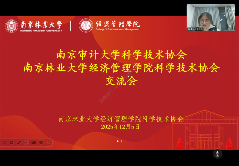 12月5日,南京审计大学科学技术协会与南京林业大学经济管理学院科学技术协会围绕科协工作发展与科创育人实践,开展了一场线上交流会议。双方代表共聚云端,分享经验,共话高校学生科协组织的建设路径与使命担当。