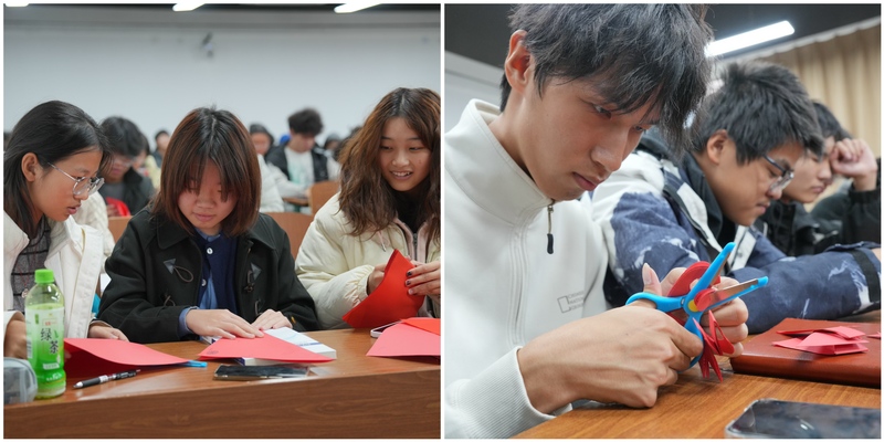 随后,活动进入“盲盒探秘·巧手初试”环节。同学们通过抽取内含不同底稿的剪纸盲盒,随机获得创作任务,“所抽即所剪”的规则,为活动增添了趣味与挑战,也让同学们在拆解线条、镂空留白的实践中,直观体悟到对称、连续的剪纸语言。现场氛围专注而宁静,只有纸屑轻落,剪刀游走,在一折一剪间,传统技艺的匠心与乐趣悄然传递。