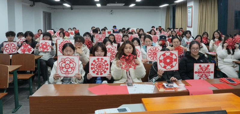 活动尾声,同学们手持自己创作的剪纸作品合影留念,红纸镂花,光影交织,映衬着青春面庞上满足的笑容。
