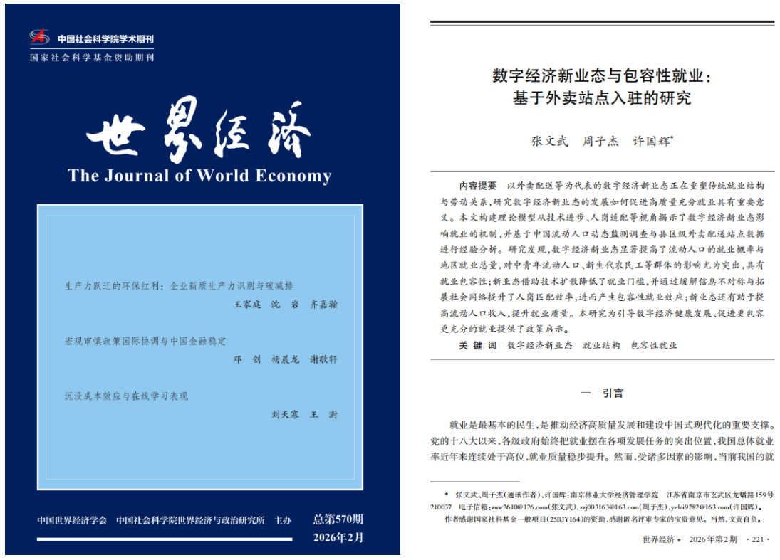 近日,我院张文武教授课题组在经济学重要期刊《世界经济》2026年第2期发表重要科研论文,论文主题为《数字经济新业态与包容性就业:基于外卖站点入驻的研究》。《世界经济》是中国社会科学院主管、中国世界经济学会与世界经济与政治研究所共同主办的学术期刊,创刊于1978年,是经济学领域的权威期刊。
