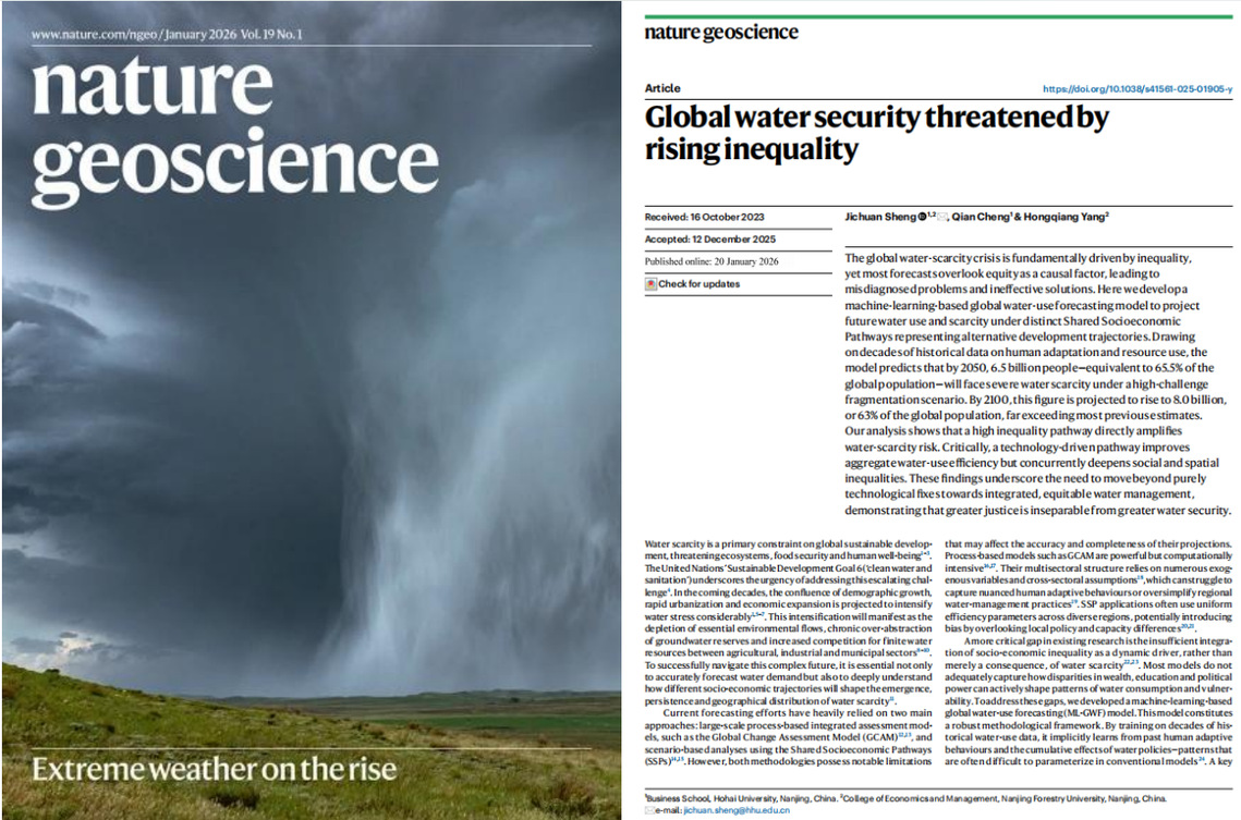 近日,盛济川教授与杨红强教授等合作在Nature Geoscience期刊发表题为“Global water security threatened by rising inequality”的研究成果,本文由河海大学和南京林业大学共同完成。该研究首次定量揭示了不平等是加剧未来全球水资源短缺的核心驱动力,并提出了统筹效率与公平的水资源治理新范式。