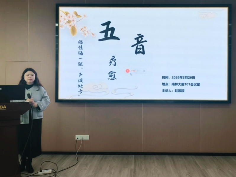 在“溯音律之源”环节,赵淑颖以中国古典五音体系为切入点,系统讲解了宫、商、角、徵、羽与五脏、五志的对应关系。她聚焦“角音属木”的调养机理,巧妙结合学校林业特色,阐释了音乐疗法调节情绪、疏解压力的现代心理学依据。赵淑颖指出,特定频率的声波能够通过听觉通路影响大脑边缘系统,调节自主神经功能,从而改善情绪状态。她还针对同学们日常可能遇到的不同情绪状态推荐了相应曲目,为大家送上了实用的音乐疗愈“小药方”。
